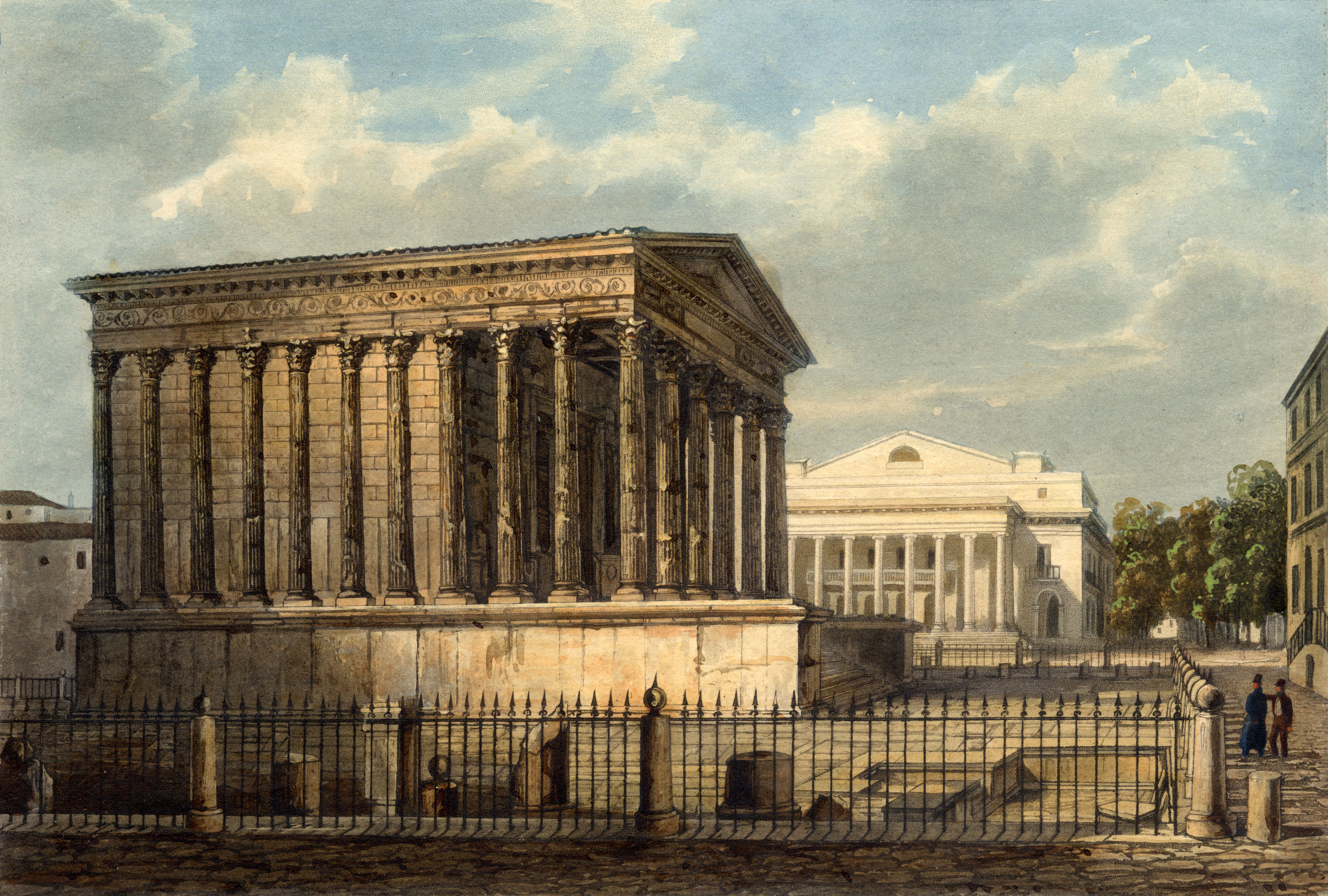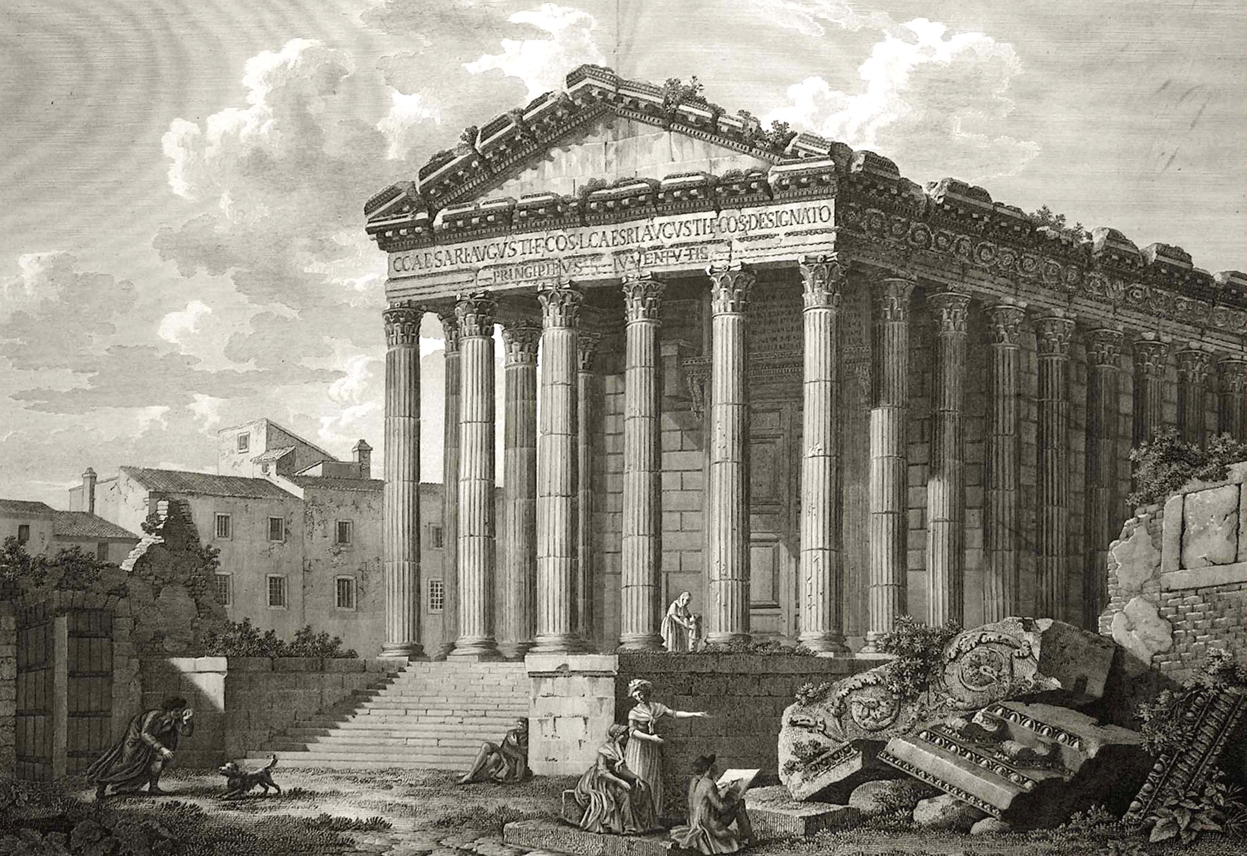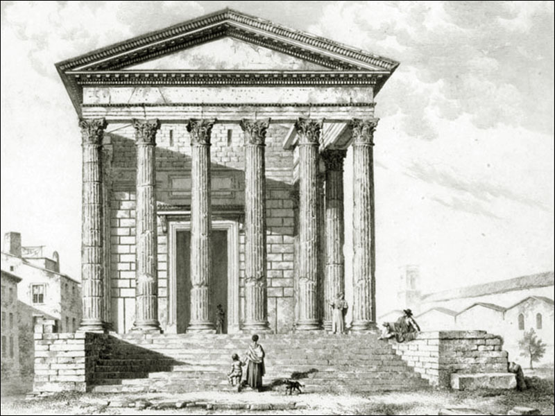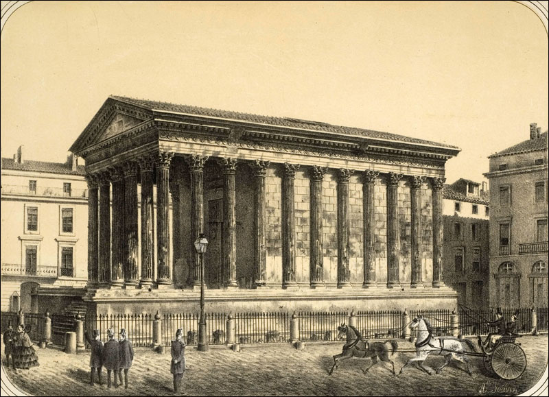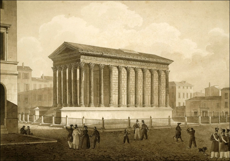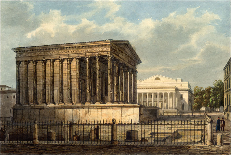 . 01 - Le Capitole, dict la Maison Quarrée, (l'original est une gravure sur bois), illustrant l'ouvrage de J. Poldo d'Albenas (1512-1563), le premier historien de la Ville de Nîmes. (reproduction gravure du livre). Le temple, vu du nord-est, est restauré dans son état d'origine, tel que pouvait l'imaginer l'auteur, sans escalier pour y accéder, car la base de l'édifice était alors enfoncée sous deux mètres de remblai provenant en partie des démolitions du portique antique, puis des maisons qui l'entouraient, au moyen-âge, et que François ler avait fait dégager, lors de sa visite à Nîmes en 1533; l'escalier avait disparu au haut Moyen-âge et son emplacement fut occupé par une chapelle, saint-Etienne de Capduel, qui fut démolie au début des troubles religieux du XVIe siècle. Aucune des mutilations subies au cours des siècles n'est visible, et l'édifice représenté ne ressemble pas au monument défiguré que l'auteur avait sous les yeux. Cette représentation est actuellement la plus ancienne, que l'on connaisse du monument. La légende fait état de deux dénominations, celle, médiévale, de "Capitole" qui désignait au Moyen-Age, un lieu d'assemblée (J.Brunel, "La Maison-Carrée a-t-elle été un Capitole dans l'École Antique, n° 2, 1967), et celle de Maison Carrée qui apparaît ensuite, et qui est tout à fait correcte, puisque le carré désignait toute figure caractérisée par ses angles droits, et rendait compte de ce qui opposait l'édifice tant aux maisons irrégulièrement bâties de la Ville, qu'aux Arènes voisines, édifice remarquable par les courbes de sa façade et de ses galeries. - Colonne, basse, chapiteau et plan de la Maison Carrée. Complément à la représentation entière de la Maison-Carrée de Poldo d'Albenas, où les détails sont à peine esquissés : ils sont en partie restitués, ici, et montrent le caractère érudit de l'ouvrage de Poldo d'Albenas. 02 - Hubert Robert (Paris 1733-1808) La Maison Carrée, les Arènes et la Tour Magne à Nîmes 1786. Ce tableau, avec 3 autres, a été commandé par Louis XVI à l'auteur pour la décoration d'une salle à manger à Fontainebleau. C'est une œuvre importante, non seulement par la notoriété de l'artiste, mais par l'atmosphère à la fois urbaine et champêtre qui règne autour du monument ; il semble qu'Hubert Robert a voulu ici justifier le nom de Maison Carrée en opposant le temple aux Arènes aux formes courbes (encore habitées) et à la Tour Magne (long rectangle). Enfin, le caractère théâtral de cette composition (attitude des personnages, disposition des ruines antiques) ouvre la voie aux vues pittoresques qui se multiplieront au cours du XIXe siècle. Reproduction photographique, cliché Musées Nationaux. Tableau exposé au Musée du Louvre. 03 - Temple of. Caius et Lucius Caesar or Maison Carrée par A. Beaumont, gravé par Apostool, illustration d'A. Beaumont select views in the south of France, with topographical et historical descriptions, London 1794. Le temple apparaît dans son enclos, vu du nord-ouest, avec la grille installée par Séguier, la petite porte communiquant sur la place, avec à l'ouest la galerie et le couvent des Augustins. Pour la première fois, les colonnes du pronaos sont entaillées et disjointes. Musée du Vieux-Nîmes. 04 - La Maison Carrée. Dessin au lavis et aquarelle, restituant le décor végétal et les balustres de la galerie des Augustins que les consuls ont récupérés pour les Jardins de la Fontaine. Musée du Vieux-Nîmes. 05 - Vue de l'extérieur de la Maison Carrée, P1. II gravée par Baltard, parue dans l'ouvrage de Clérisseau, deuxième édition en 1804. Cette gravure de grande dimension dessinée quarante ans plus tôt ainsi que l'écrit Clérisseau, garde du XVIIIe siècle ce caractère dramatique et cette mise en scène savante, déjà vue chez Hubert Robert, mais elle montre un édifice antique à demi ruiné, témoignage d'un réalisme qui va s'imposer définitivement. Musée du Vieux-Nîmes. Cliquer sur l'image pour agrandir et télécharger en HD