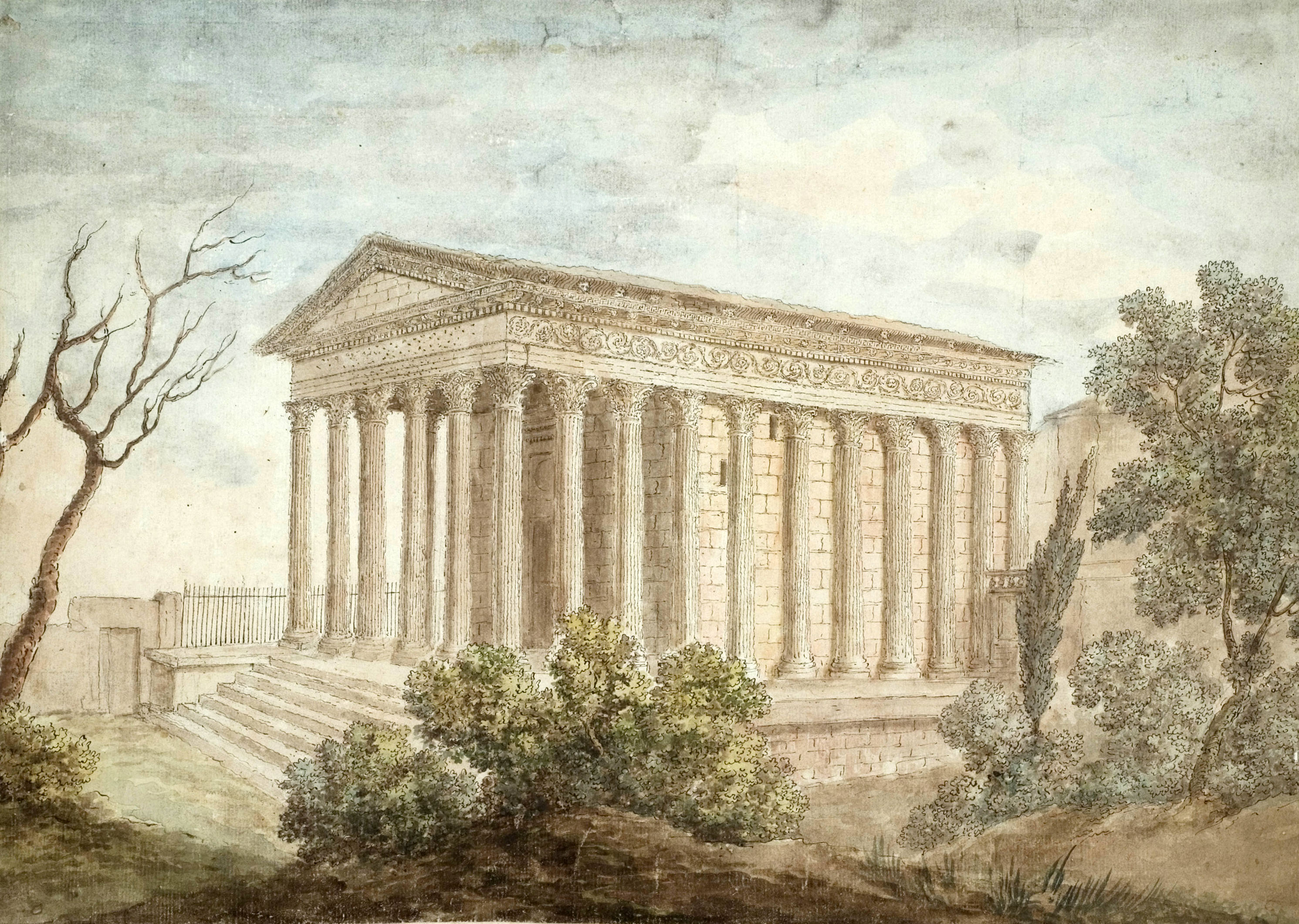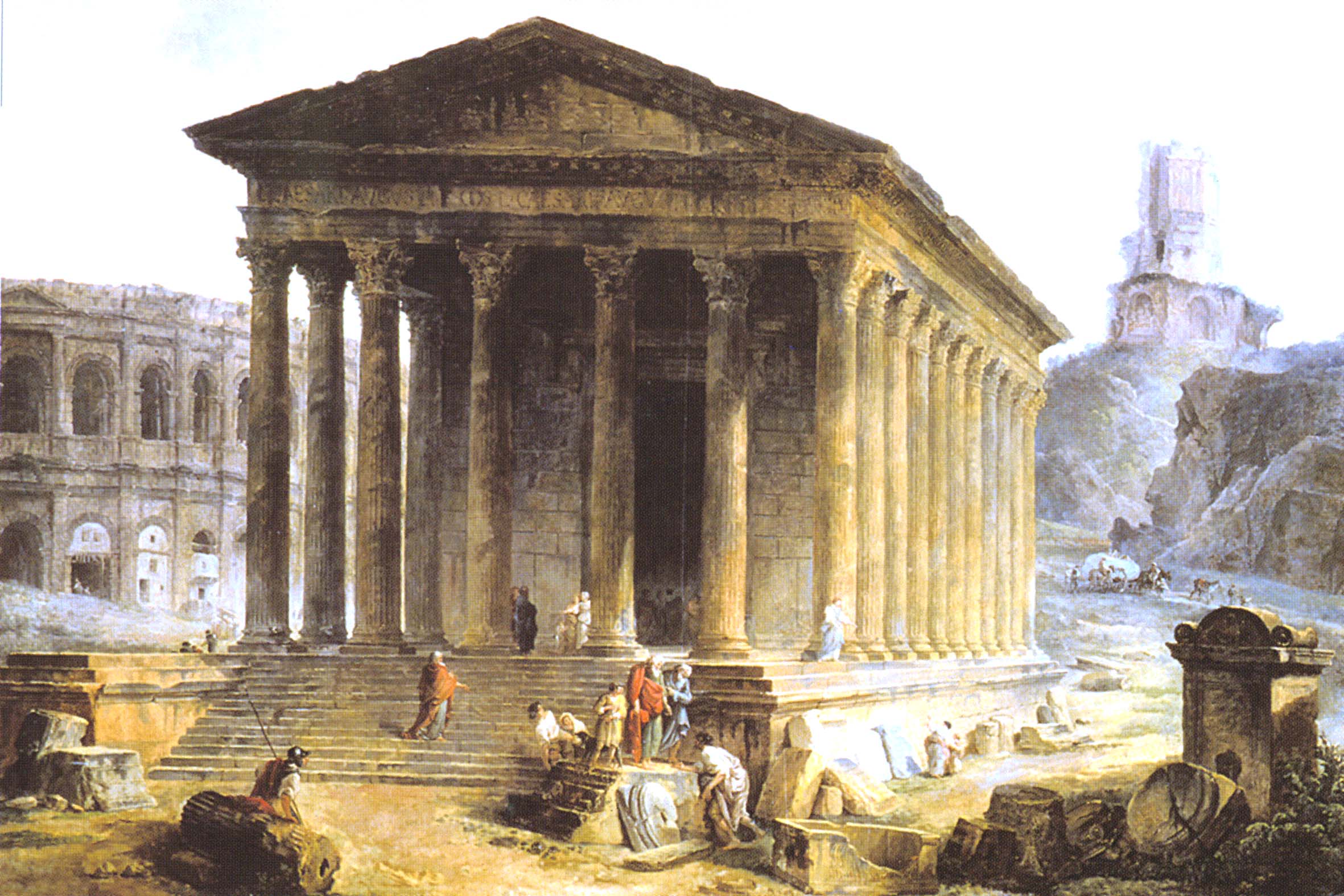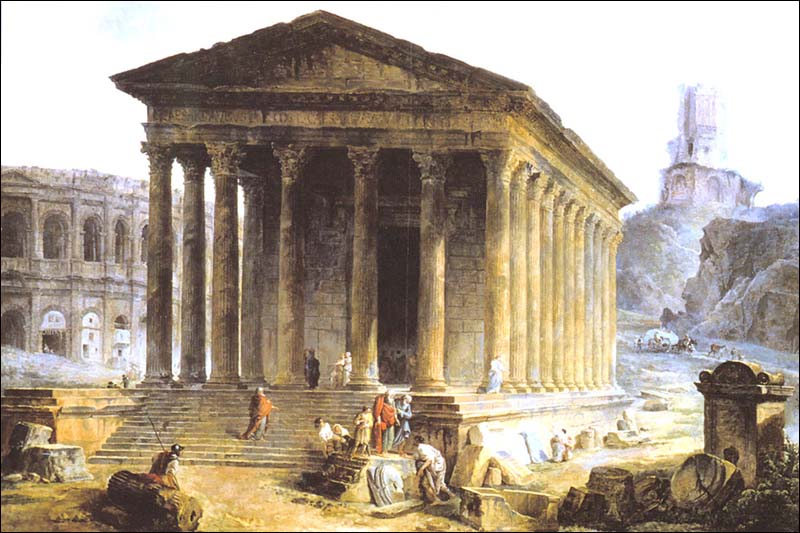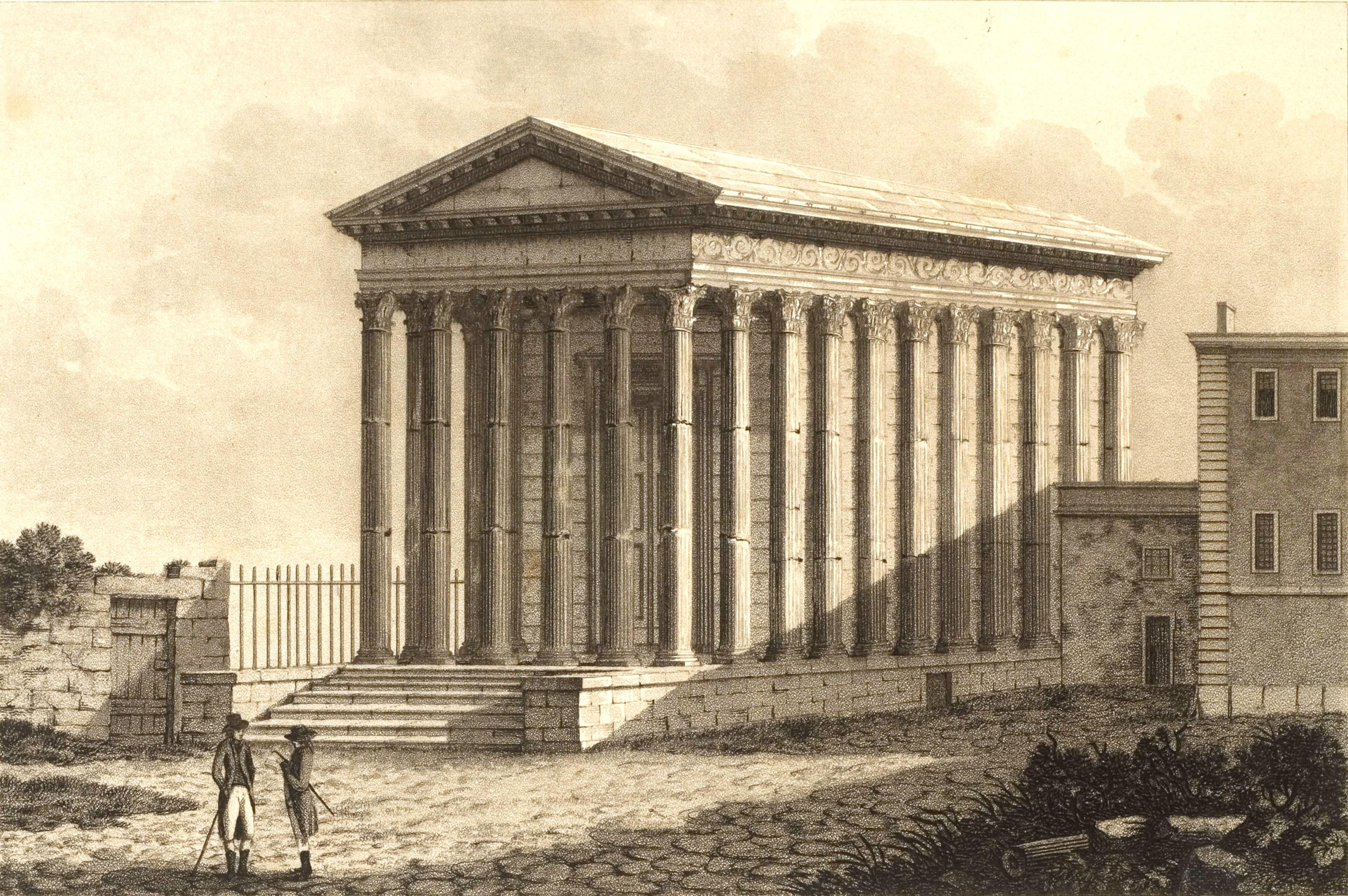. 01 - Le Capitole, dict la Maison Quarrée, (l'original est une gravure sur bois), illustrant l'ouvrage de J. Poldo d'Albenas (1512-1563), le premier historien de la Ville de Nîmes. (reproduction gravure du livre). Le temple, vu du nord-est, est restauré dans son état d'origine, tel que pouvait l'imaginer l'auteur, sans escalier pour y accéder, car la base de l'édifice était alors enfoncée sous deux mètres de remblai provenant en partie des démolitions du portique antique, puis des maisons qui l'entouraient, au moyen-âge, et que François ler avait fait dégager, lors de sa visite à Nîmes en 1533; l'escalier avait disparu au haut Moyen-âge et son emplacement fut occupé par une chapelle, saint-Etienne de Capduel, qui fut démolie au début des troubles religieux du XVIe siècle. Aucune des mutilations subies au cours des siècles n'est visible, et l'édifice représenté ne ressemble pas au monument défiguré que l'auteur avait sous les yeux. Cette représentation est actuellement la plus ancienne, que l'on connaisse du monument. La légende fait état de deux dénominations, celle, médiévale, de "Capitole" qui désignait au Moyen-Age, un lieu d'assemblée (J.Brunel, "La Maison-Carrée a-t-elle été un Capitole dans l'École Antique, n° 2, 1967), et celle de Maison Carrée qui apparaît ensuite, et qui est tout à fait correcte, puisque le carré désignait toute figure caractérisée par ses angles droits, et rendait compte de ce qui opposait l'édifice tant aux maisons irrégulièrement bâties de la Ville, qu'aux Arènes voisines, édifice remarquable par les courbes de sa façade et de ses galeries. - Colonne, basse, chapiteau et plan de la Maison Carrée. Complément à la représentation entière de la Maison-Carrée de Poldo d'Albenas, où les détails sont à peine esquissés : ils sont en partie restitués, ici, et montrent le caractère érudit de l'ouvrage de Poldo d'Albenas. 02 - Hubert Robert (Paris 1733-1808) La Maison Carrée, les Arènes et la Tour Magne à Nîmes 1786. Ce tableau, avec 3 autres, a été commandé par Louis XVI à l'auteur pour la décoration d'une salle à manger à Fontainebleau. C'est une œuvre importante, non seulement par la notoriété de l'artiste, mais par l'atmosphère à la fois urbaine et champêtre qui règne autour du monument ; il semble qu'Hubert Robert a voulu ici justifier le nom de Maison Carrée en opposant le temple aux Arènes aux formes courbes (encore habitées) et à la Tour Magne (long rectangle). Enfin, le caractère théâtral de cette composition (attitude des personnages, disposition des ruines antiques) ouvre la voie aux vues pittoresques qui se multiplieront au cours du XIXe siècle. Reproduction photographique, cliché Musées Nationaux. Tableau exposé au Musée du Louvre. 03 - Temple of. Caius et Lucius Caesar or Maison Carrée par A. Beaumont, gravé par Apostool, illustration d'A. Beaumont select views in the south of France, with topographical et historical descriptions, London 1794. Le temple apparaît dans son enclos, vu du nord-ouest, avec la grille installée par Séguier, la petite porte communiquant sur la place, avec à l'ouest la galerie et le couvent des Augustins. Pour la première fois, les colonnes du pronaos sont entaillées et disjointes. Musée du Vieux-Nîmes. 04 - La Maison Carrée. Dessin au lavis et aquarelle, restituant le décor végétal et les balustres de la galerie des Augustins que les consuls ont récupérés pour les Jardins de la Fontaine. Musée du Vieux-Nîmes. 05 - Vue de l'extérieur de la Maison Carrée, P1. II gravée par Baltard, parue dans l'ouvrage de Clérisseau, deuxième édition en 1804. Cette gravure de grande dimension dessinée quarante ans plus tôt ainsi que l'écrit Clérisseau, garde du XVIIIe siècle ce caractère dramatique et cette mise en scène savante, déjà vue chez Hubert Robert, mais elle montre un édifice antique à demi ruiné, témoignage d'un réalisme qui va s'imposer définitivement. Musée du Vieux-Nîmes. Cliquer sur l'image pour agrandir et télécharger en HD