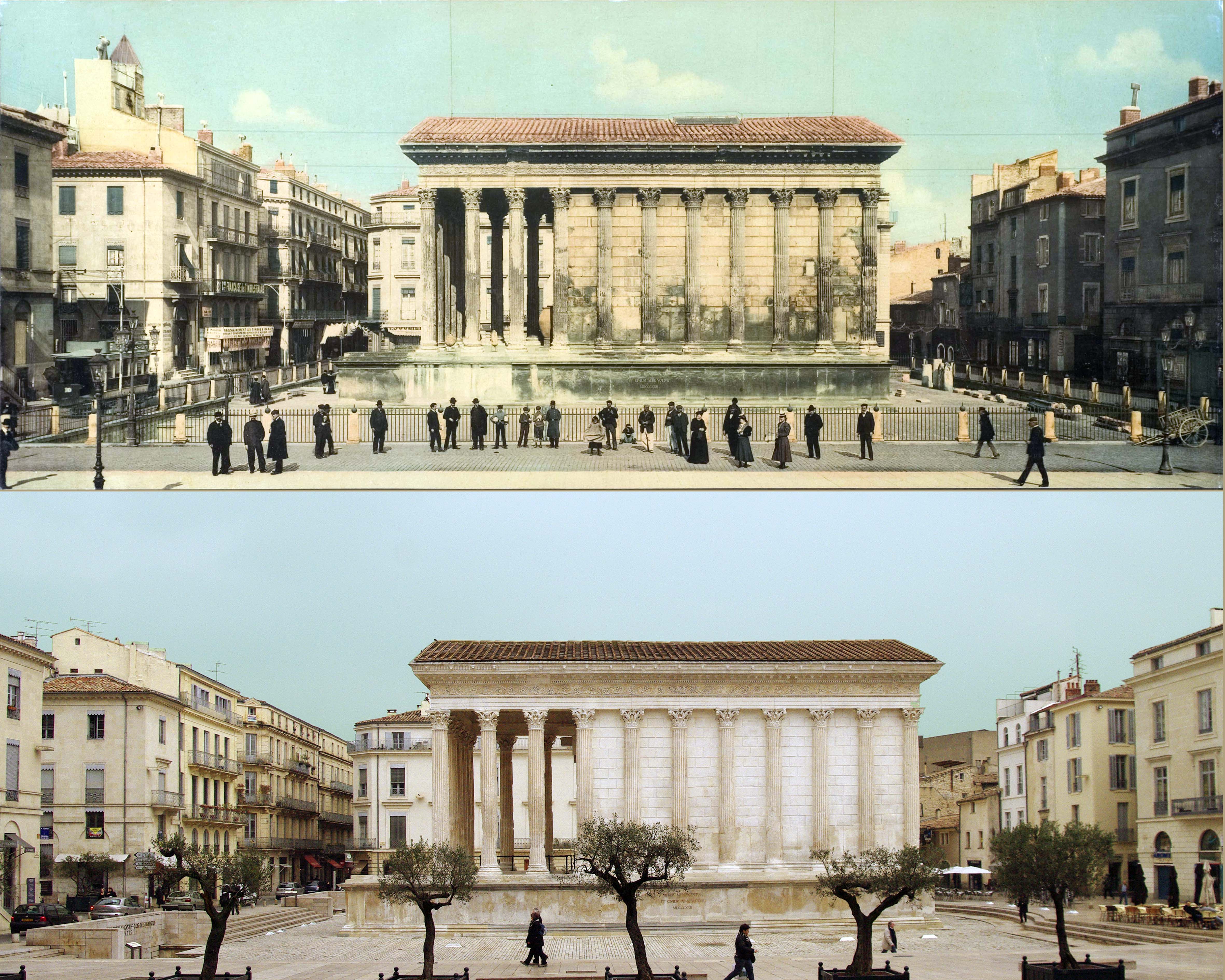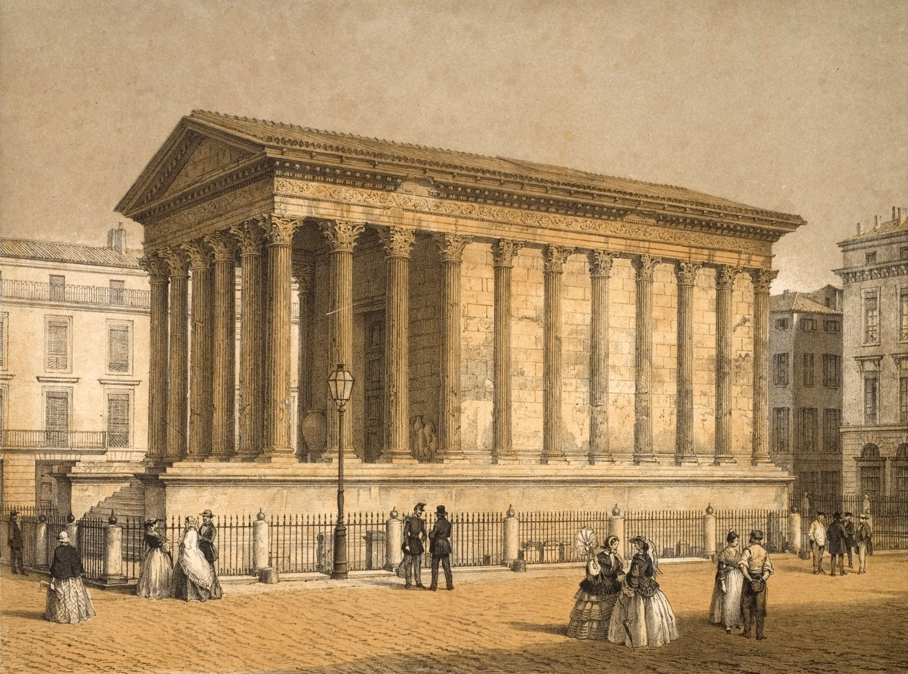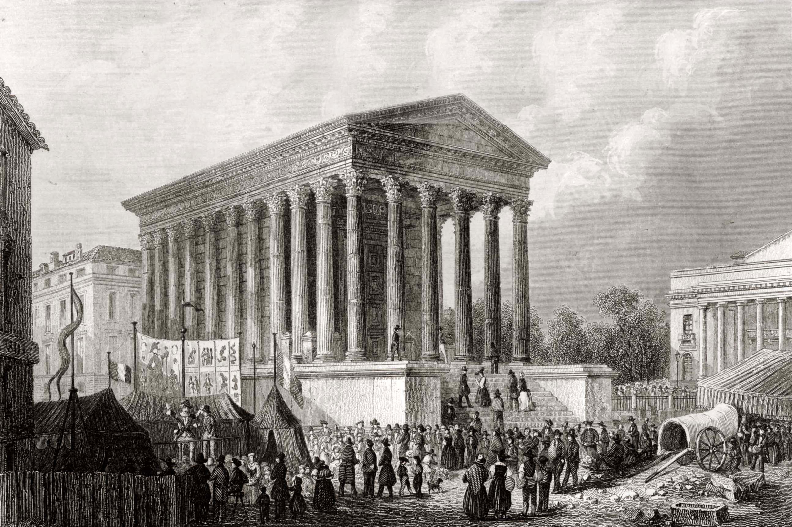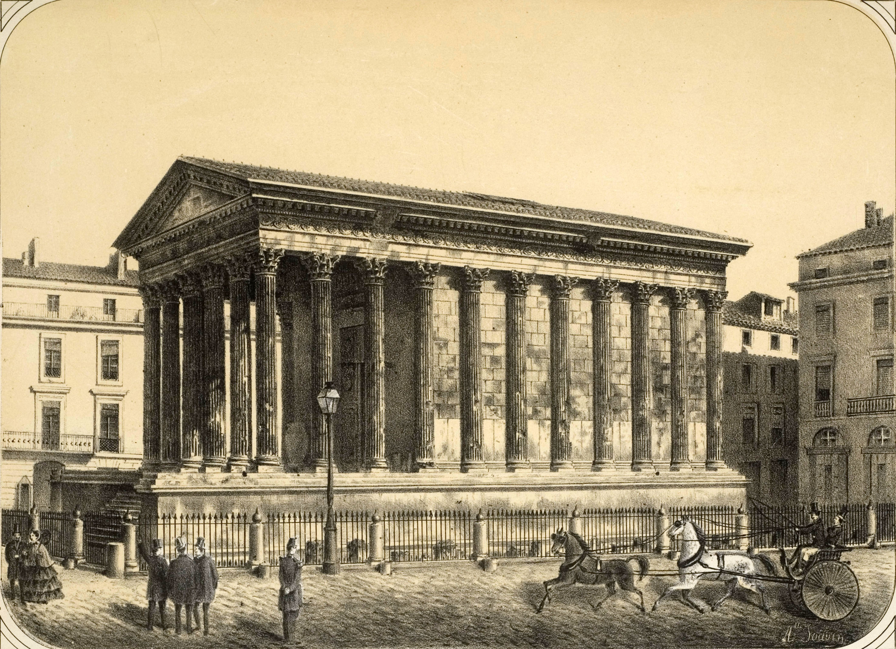 06 - Maison Carrée à Nimes par Asselineau dans "La France de nos jours". Lithographie en couleurs. 1860. Cette jolie lithographie est rendue intéressante par l'animation qui règne autour de la Maison Carrée. Noter l'apparition du lampadaire. Musée du Vieux-Nîmes. 07 - Maison Carrée, Nîmes, par A. Jouvin, litographie Dhombres à Nîmes, publiée par B. Garve. Le pittoresque et le mouvement dominant ici, dans cette présentation du monument. Musée du Vieux-Nîmes. 08 - Nîmes, Maison Carrée n° 31 par Chapuy et Salathée à Paris, chez Rittner et Goupil. Nous nous rapprochons d'une Maison Carrée disposée latéralement, permettant de voir, de face le théâtre et le Perron de la maison au nord du monument. Musée du Vieux Nîmes. 09 - Vue de la Maison Carrée et du Théâtre 243, par Deroy, litho de Becquet frères dans "La France en miniature 1860", lithographie en couleurs et en bistre ; parues ici en album: "Souvenir de Nîmes". La Maison Carrée est associée au théâtre, mais beaucoup de détails nous détournent d'elle : le balcon de la maison, au Nord, avec l'enseigne en forme d'écu, les personnages qui se dirigent vers le théâtre... Musée du Vieux-Nîmes. 10 - Temple de Nismes, connu sous le nom de Maison Carrée, P1. LV par Baltard et Bance. (Laborde). C'est une vue de face du monument ruiné avec à l'est, les maisons en saillie, à l'ouest l'église St-Paul (ancienne église des Récollets autrefois, hors des remparts). Noter l'attitude et l'habillement des personnages mi-romains, mi-bergers. Musée du Vieux-Nîmes. 11 - Maison Carrée à Nîmes - Gard . tome III t1. par F.A. Parnot et Lhuiltier, vers 1850. La foire, et tous ses divertissements est ici l'événement essentiel, bien que le monument, vu d'assez près, domine par sa masse et son élégance. Collection Gérard Taillefer. 12 - Représentation de la Maison Carrée vers 1860. 13 - Carte postale de la Maison Carrée début XXe siècle. 14 - Voitures de place stationnées devant la Maison Carrée en 1912 (taxis hippomobiles). Les autorisations étaient allouées par trimestre, par la commission des finances moyennant une redevance de 18 fr par trimestre, du 1er avril au 30 septembre et de 12 fr par trimestre du 1er octobre au 31 mars. 15 - Carte postale ancienne. Musée de la Maison Carrée début des années 1880. Collection Gérard Taillefer. ![]() Ce document n'est pas disponible en téléchargement 16 - Carte postale - Photo aérienne début années 1950. Ce document n'est pas libre de droit. 17 - Première maquette de la Maison-Carré, réalisée en liège par Auguste Pelet. Elle a figuré à l'exposition de Paris en 1839. Musée archéologique de Nîmes. Photo Deyan Stokic. 18 - Inauguration des travaux de la Maison carrée du 12 février 2011. Spectacle d'images réalisé par la société "Cosmo AV Sarl" Photo Georges Mathon 19 - Musée de la Maison Carrée vers 1900. Carte postale colorisée, collection Gérard Taillefer. 20 - Inauguration des travaux de la Maison carrée du 12 février 2011. Spectacle d'images réalisé par la société "Cosmo AV Sarl" Photo Georges Mathon 21 - Nismes, intérieur du Musée. Languedoc P1. 266 par le Cte de Turpin de Crissé (1835), litho. de Thierry frères (Taylor et Nodier). C'est la seule représentation du musée de la Maison Carrée que nous connaissions avant celles données par la photographie à la fin du XIXe siècle. C'est un musée de peinture et d'archéologie, et l'on retrouve de nombreuses œuvres actuellement conservées dans les divers musées de la Ville : noter l'admiration du visiteur en découvrant le musée. Musée du Vieux-Nîmes. 22 - Inauguration des travaux de la Maison carrée du 12 février 2011. Spectacle d'images réalisé par la société "Cosmo AV Sarl" Projection de la lithographie de Thierry frères, n°21 dans ce catalogue. Photo Georges Mathon 23 - Un siècle sépare ces deux photos. Cliché du haut (musée du vieux Nîmes), 1911 colorisé et cliché du bas 2011. (Georges Mathon) 24 - Le Forum gallo-romain de Nemausus par Ferdinand Pertus Né à Nîmes en 1883, Ferdinand Pertus était le fils d'un directeur de la banque Arnaud-Gaidan. Un banquier ne pouvait considérer qu'avec méfiance l'enthousiasme du jeune peintre. Il exigea que son fils fît de solides études. Ainsi, parallèlement à son activité artistique, Ferdinand Pertus étudia le Droit et devint notaire à Marguerittes. C'est après 1920 semble-t-il que le peintre-notaire se tourna plus particulièrement vers l'enluminure et que son œuvre devint rapidement célèbre. Hubert Rouger, maire de Nîmes de 1925 à 1940, appréciait particulièrement les œuvres de Pertus. Il lui demanda une série de tableaux, traités en enluminures, qui retraceraient l'histoire des gens de Nîmes. Il s'agissait d'en décorer la salle des mariages de l'Hôtel de Ville. Pertus se transforma en historien, fouilla les archives, retrouva les vieilles rues nîmoises de chaque époque, reconstitua les évènements, les costumes... Enfin, il créa une série d'œuvres qui, de nos jours encore, frappent par leur vérité. Georges
