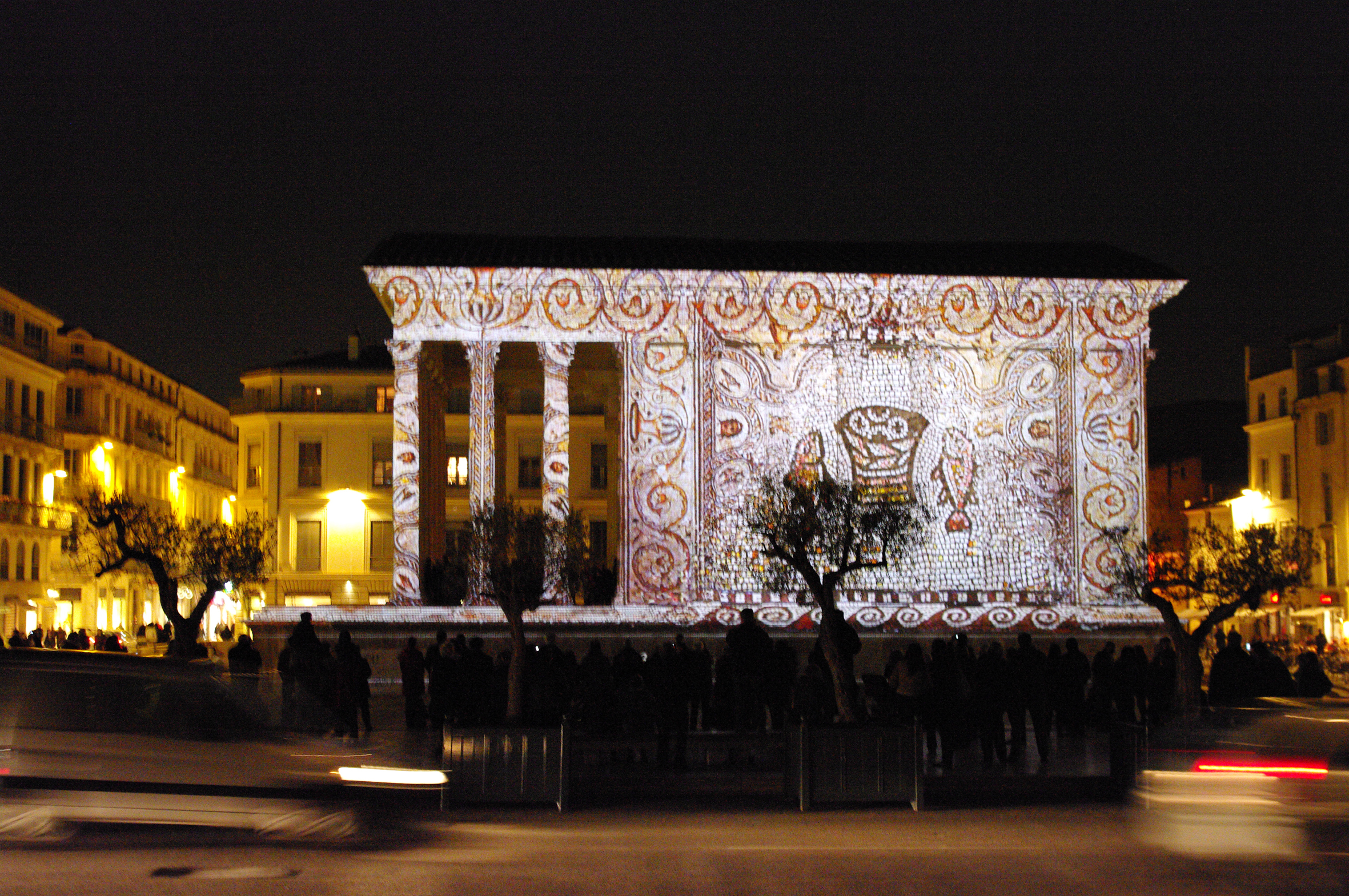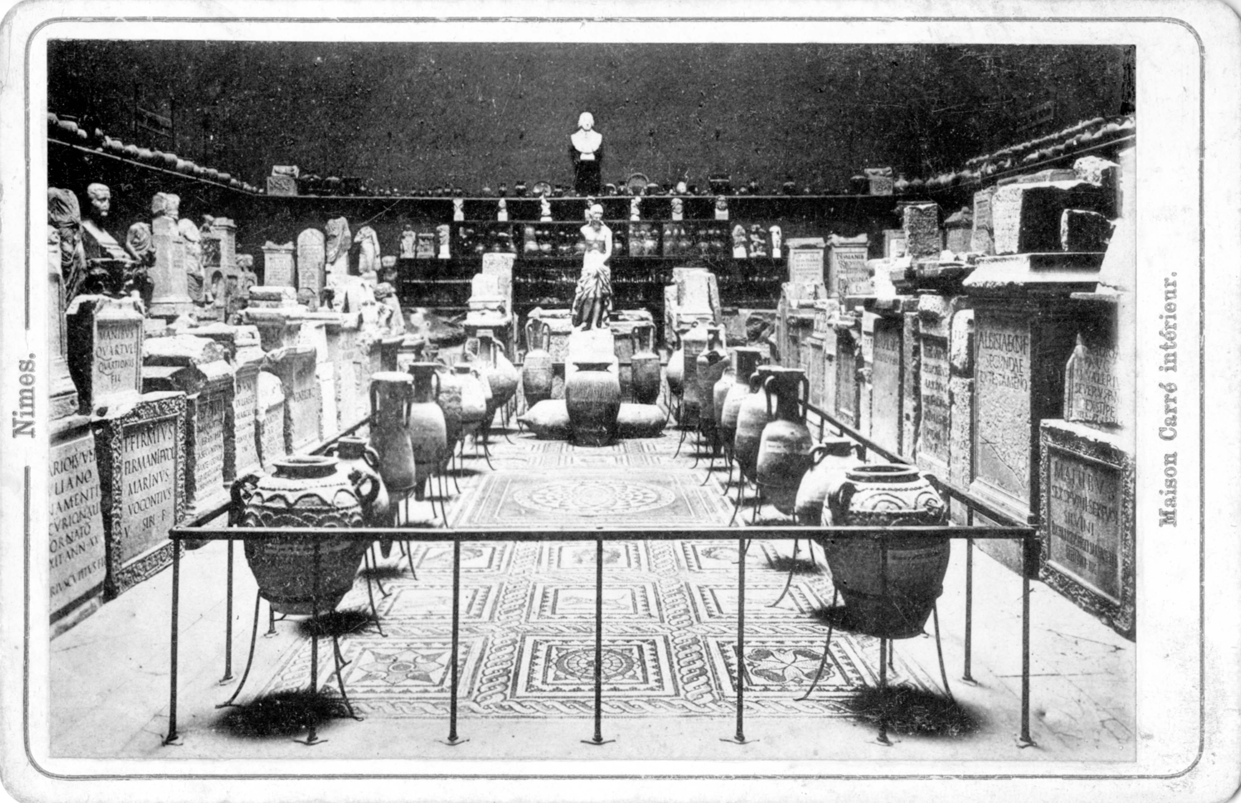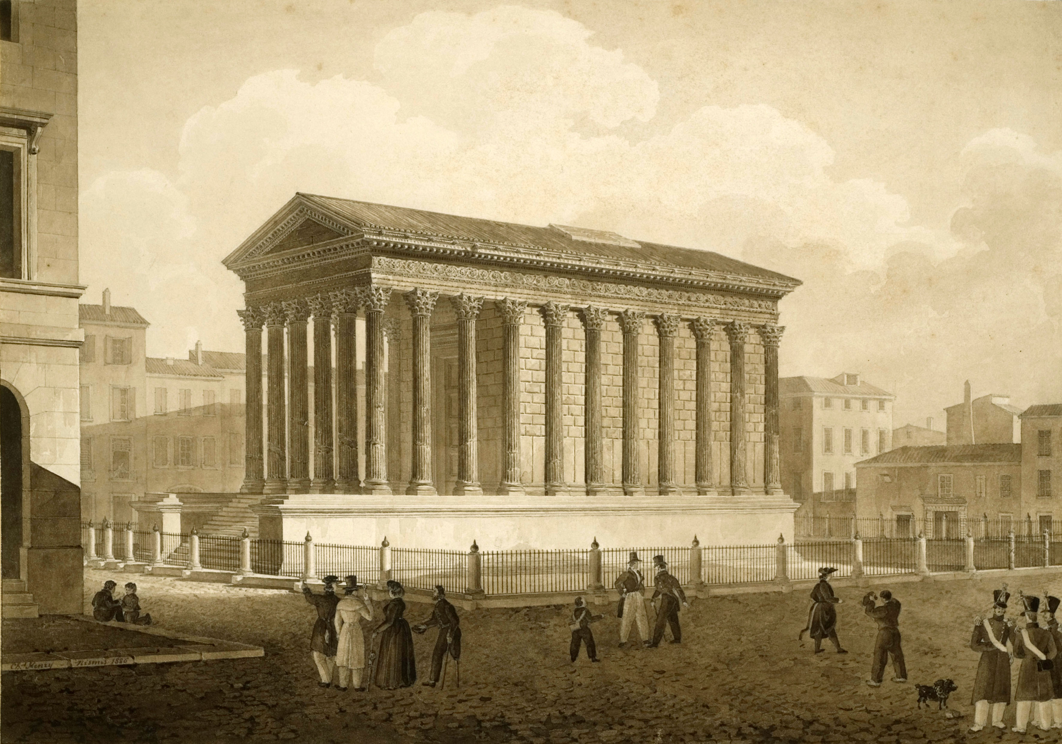 06 - Maison Carrée à Nimes par Asselineau dans "La France de nos jours". Lithographie en couleurs. 1860. Cette jolie lithographie est rendue intéressante par l'animation qui règne autour de la Maison Carrée. Noter l'apparition du lampadaire. Musée du Vieux-Nîmes. 07 - Maison Carrée, Nîmes, par A. Jouvin, litographie Dhombres à Nîmes, publiée par B. Garve. Le pittoresque et le mouvement dominant ici, dans cette présentation du monument. Musée du Vieux-Nîmes. 08 - Nîmes, Maison Carrée n° 31 par Chapuy et Salathée à Paris, chez Rittner et Goupil. Nous nous rapprochons d'une Maison Carrée disposée latéralement, permettant de voir, de face le théâtre et le Perron de la maison au nord du monument. Musée du Vieux Nîmes. 09 - Vue de la Maison Carrée et du Théâtre 243, par Deroy, litho de Becquet frères dans "La France en miniature 1860", lithographie en couleurs et en bistre ; parues ici en album: "Souvenir de Nîmes". La Maison Carrée est associée au théâtre, mais beaucoup de détails nous détournent d'elle : le balcon de la maison, au Nord, avec l'enseigne en forme d'écu, les personnages qui se dirigent vers le théâtre... Musée du Vieux-Nîmes. 10 - Temple de Nismes, connu sous le nom de Maison Carrée, P1. LV par Baltard et Bance. (Laborde). C'est une vue de face du monument ruiné avec à l'est, les maisons en saillie, à l'ouest l'église St-Paul (ancienne église des Récollets autrefois, hors des remparts). Noter l'attitude et l'habillement des personnages mi-romains, mi-bergers. Musée du Vieux-Nîmes. 11 - Maison Carrée à Nîmes - Gard . tome III t1. par F.A. Parnot et Lhuiltier, vers 1850. La foire, et tous ses divertissements est ici l'événement essentiel, bien que le monument, vu d'assez près, domine par sa masse et son élégance. Collection Gérard Taillefer. 12 - Représentation de la Maison Carrée vers 1860. 13 - Carte postale de la Maison Carrée début XXe siècle. 14 - Voitures de place stationnées devant la Maison Carrée en 1912 (taxis hippomobiles). Les autorisations étaient allouées par trimestre, par la commission des finances moyennant une redevance de 18 fr par trimestre, du 1er avril au 30 septembre et de 12 fr par trimestre du 1er octobre au 31 mars. 15 - Carte postale ancienne. Musée de la Maison Carrée début des années 1880. Collection Gérard Taillefer. ![]() Ce document n'est pas disponible en téléchargement 16 - Carte postale - Photo aérienne début années 1950. Ce document n'est pas libre de droit. 17 - Première maquette de la Maison-Carré, réalisée en liège par Auguste Pelet. Elle a figuré à l'exposition de Paris en 1839. Musée archéologique de Nîmes. Photo Deyan Stokic. 18 - Inauguration des travaux de la Maison carrée du 12 février 2011. Spectacle d'images réalisé par la société "Cosmo AV Sarl" Photo Georges Mathon 19 - Musée de la Maison Carrée vers 1900. Carte postale colorisée, collection Gérard Taillefer. 20 - Inauguration des travaux de la Maison carrée du 12 février 2011. Spectacle d'images réalisé par la société "Cosmo AV Sarl" Photo Georges Mathon 21 - Nismes, intérieur du Musée. Languedoc P1. 266 par le Cte de Turpin de Crissé (1835), litho. de Thierry frères (Taylor et Nodier). C'est la seule représentation du musée de la Maison Carrée que nous connaissions avant celles données par la photographie à la fin du XIXe siècle. C'est un musée de peinture et d'archéologie, et l'on retrouve de nombreuses œuvres actuellement conservées dans les divers musées de la Ville : noter l'admiration du visiteur en découvrant le musée. Musée du Vieux-Nîmes. 22 - Inauguration des travaux de la Maison carrée du 12 février 2011. Spectacle d'images réalisé par la société "Cosmo AV Sarl" Projection de la lithographie de Thierry frères, n°21 dans ce catalogue. Photo Georges Mathon 23 - Un siècle sépare ces deux photos. Cliché du haut (musée du vieux Nîmes), 1911 colorisé et cliché du bas 2011. (Georges Mathon) 24 - Le Forum gallo-romain de Nemausus par Ferdinand Pertus Né à Nîmes en 1883, Ferdinand Pertus était le fils d'un directeur de la banque Arnaud-Gaidan. Un banquier ne pouvait considérer qu'avec méfiance l'enthousiasme du jeune peintre. Il exigea que son fils fît de solides études. Ainsi, parallèlement à son activité artistique, Ferdinand Pertus étudia le Droit et devint notaire à Marguerittes. C'est après 1920 semble-t-il que le peintre-notaire se tourna plus particulièrement vers l'enluminure et que son œuvre devint rapidement célèbre. Hubert Rouger, maire de Nîmes de 1925 à 1940, appréciait particulièrement les œuvres de Pertus. Il lui demanda une série de tableaux, traités en enluminures, qui retraceraient l'histoire des gens de Nîmes. Il s'agissait d'en décorer la salle des mariages de l'Hôtel de Ville. Pertus se transforma en historien, fouilla les archives, retrouva les vieilles rues nîmoises de chaque époque, reconstitua les évènements, les costumes... Enfin, il créa une série d'œuvres qui, de nos jours encore, frappent par leur vérité. Georges