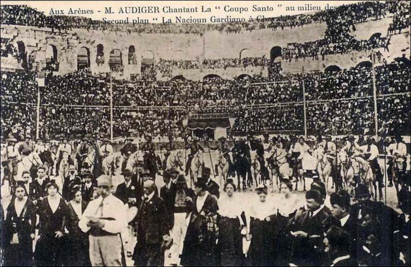 Ces deux derniers couplets furent ajoutés lors de la visite à Nîmes du Président de la République "Gaston Doumergues". Ils furent chantés, le 12 octobre 1924 par François Audiger (*) à la Fête donnée aux Arènes en l'honneur du Chef de l'Etat.
